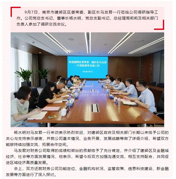 南京市建邺区区委常委、副区长马友君一行莅临公司调研指导工作